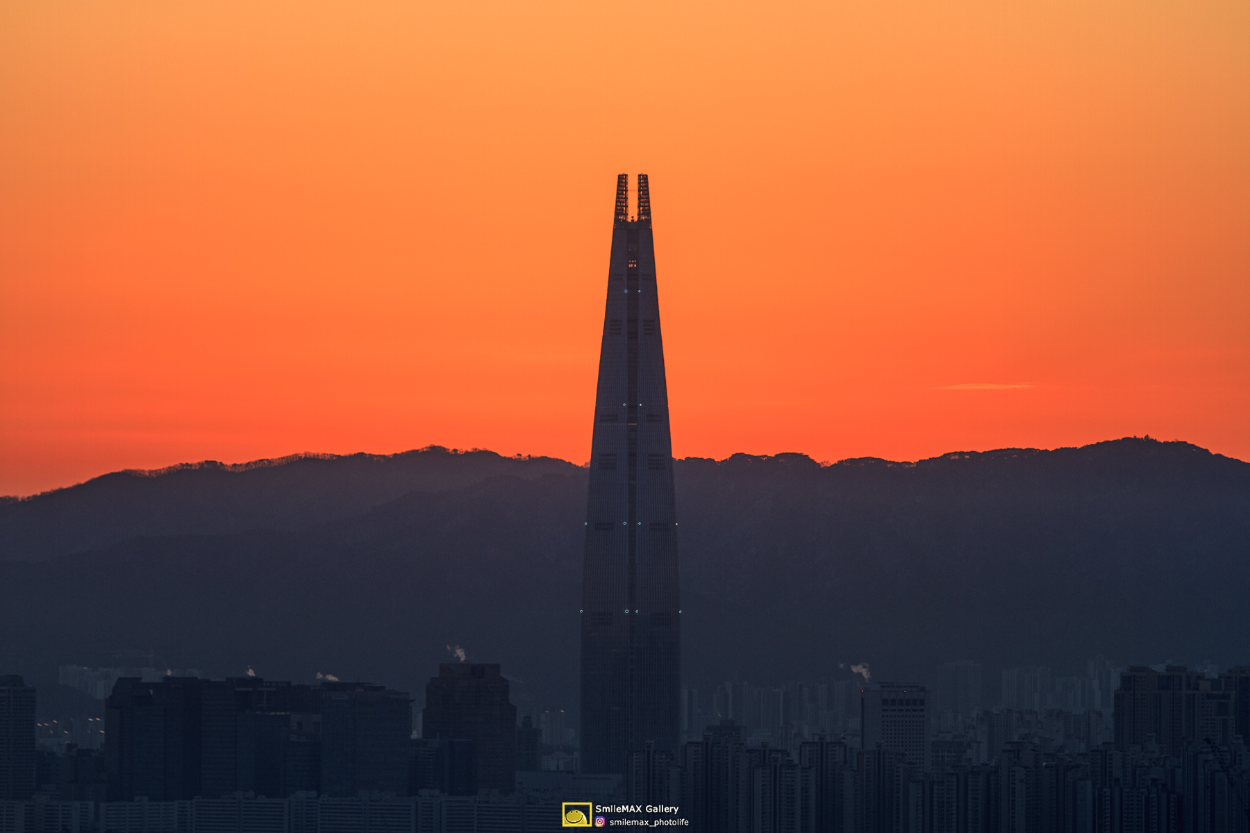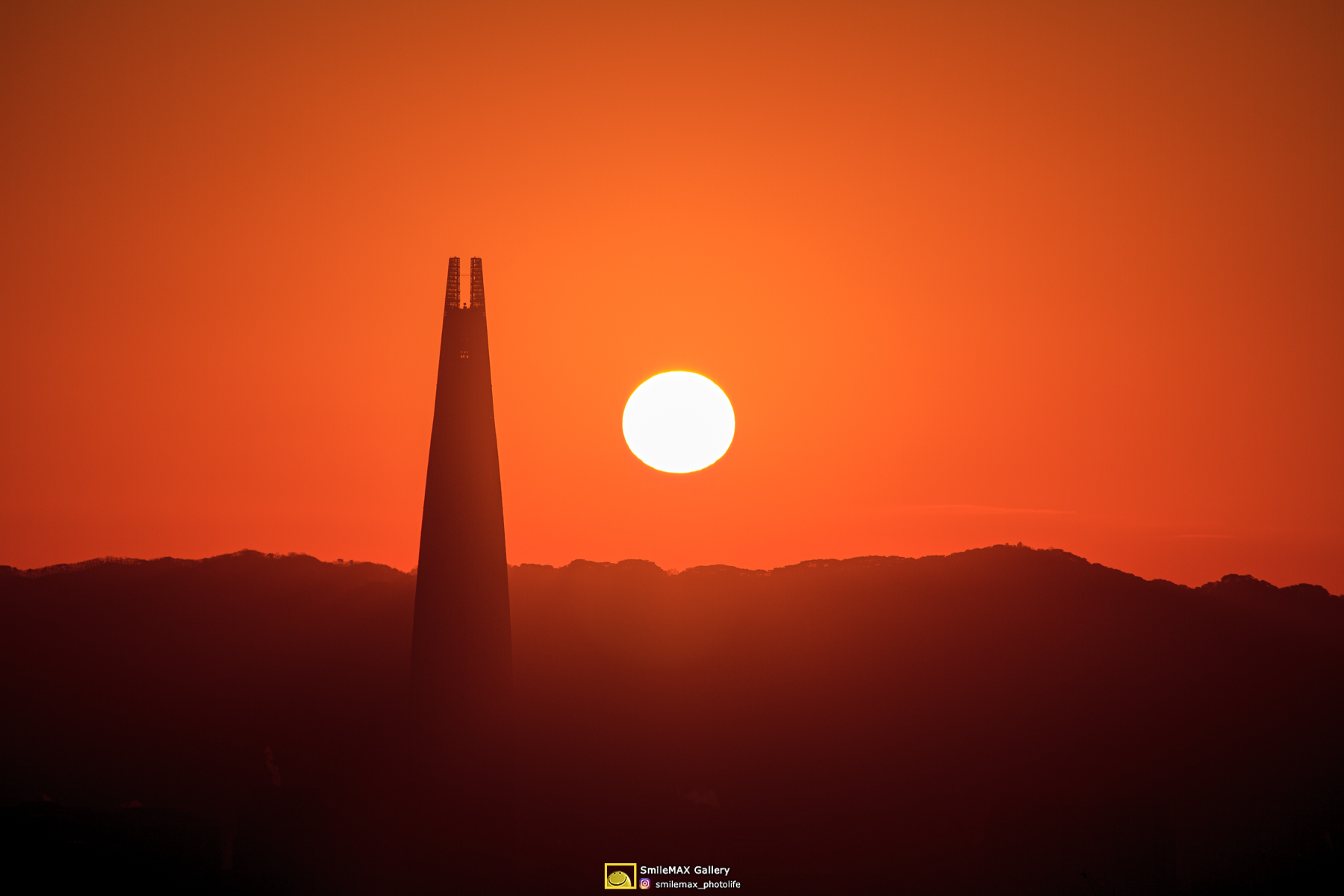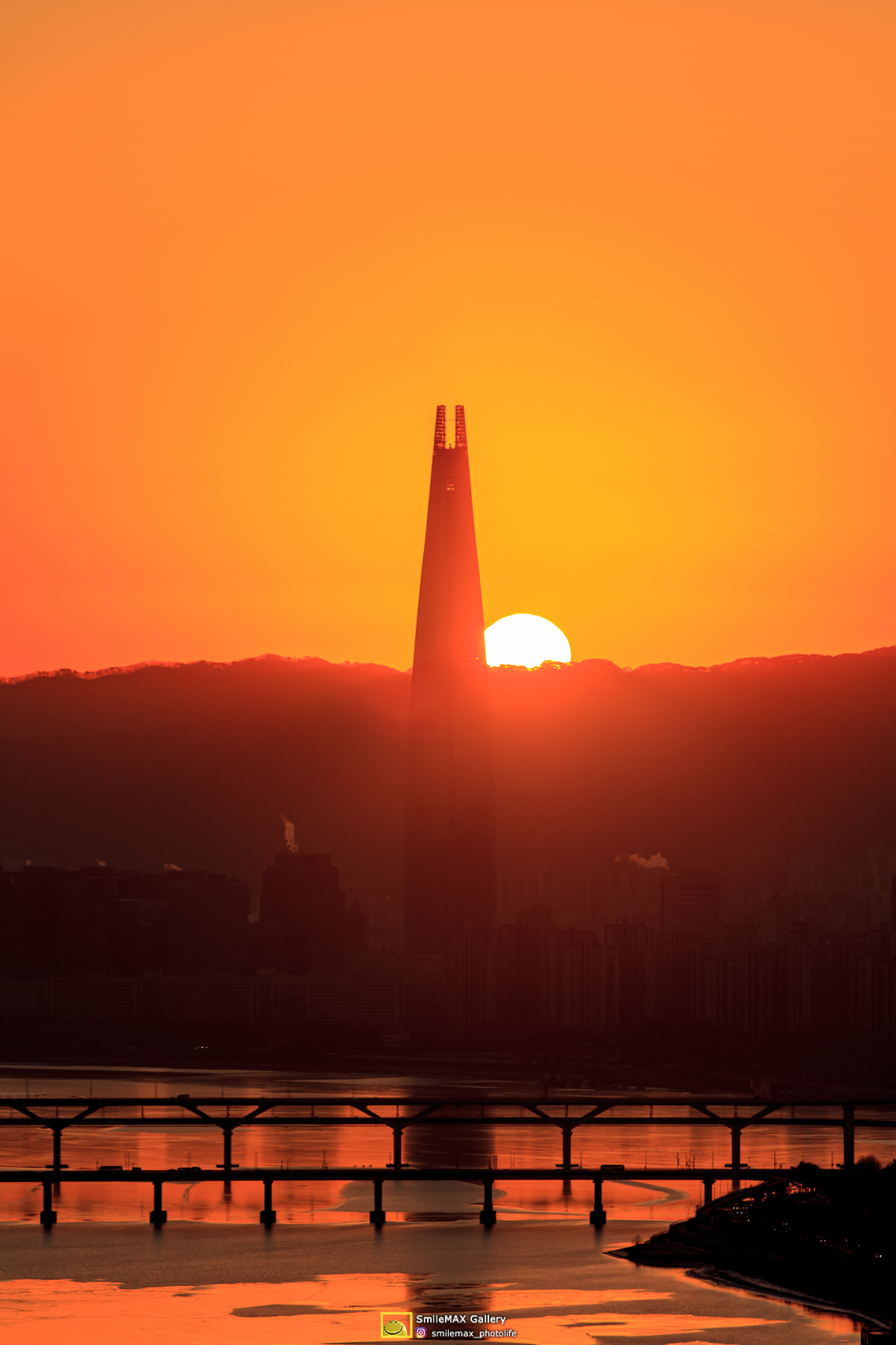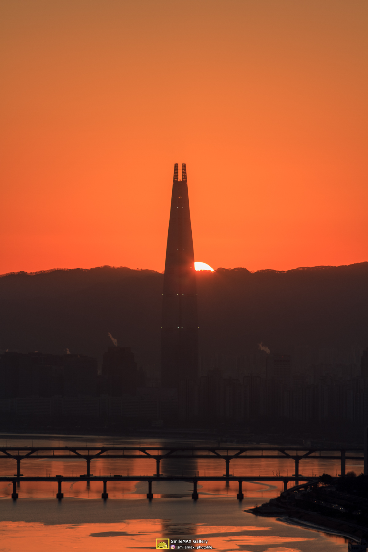 가끔 보긴 했던 롯데타워 꼭대기에 걸쳐진 태양 사진..
